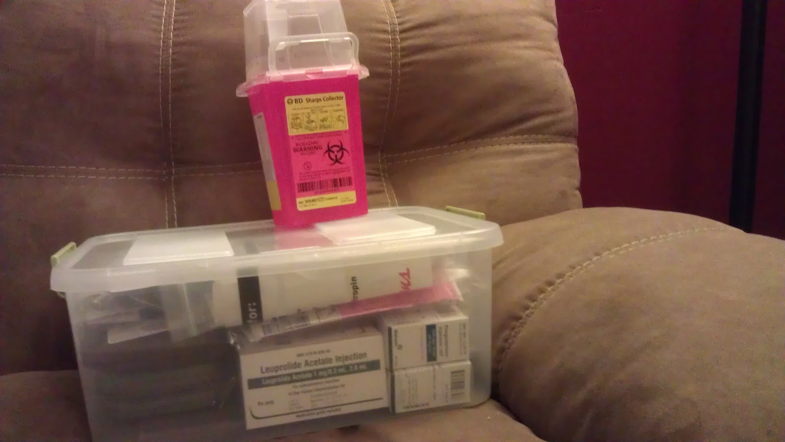 Danny left for his game and I started gathering everything I could POSSIBLY need. The box of Lupron. The big box the lupron and supplies came in. The extra supply bag. The welcome bag which included a DVD (even though Danielle knows how to give the shots). My calendar, so I could double check the dosage. The sharps container.